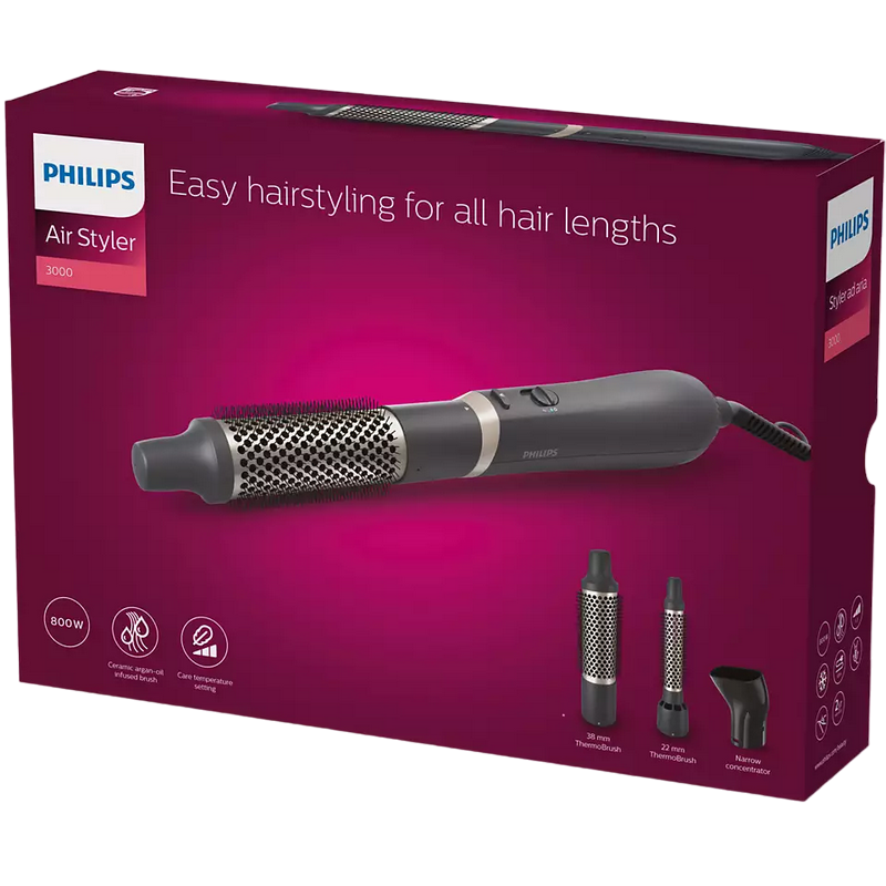 Consum energie: 800 W Numar regime de temperatura: 3 Moduri de operare a fluxului de aer: 2 Aprovizionare cu aer rece Tensiune 220-240 V Perie de ulei de argan Setare Care+ pentru o protecție mai bună Cablu cu balama
