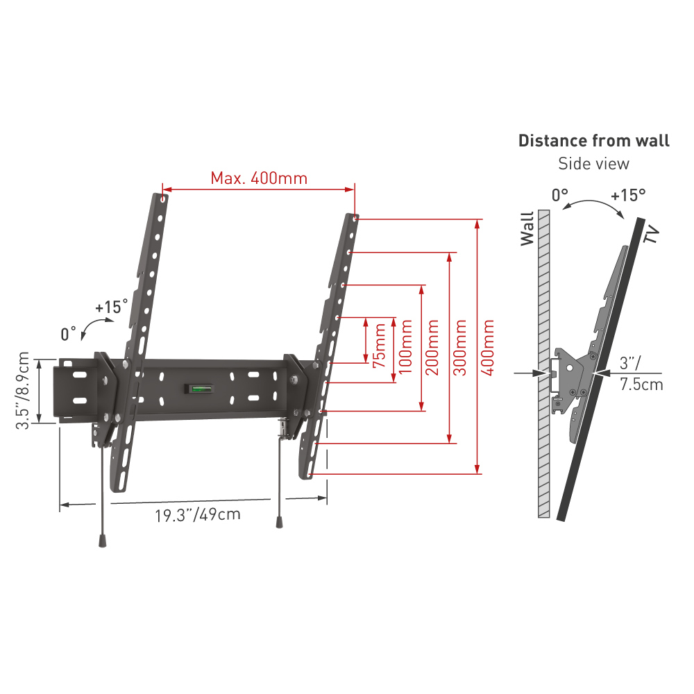 Dimensiune minimă Ecran: 19 " Dimensiune maximă Ecran: 65 " Greutate maximă de încărcare: 50 kg Interval de înclinare: +0 °/-15 ° Compatibilitate cu suportul VESA: 75x75, 100x100, 100x200, 200x100, 200x200, 300x300, 300x400, 400x200, 400x300, 400x400